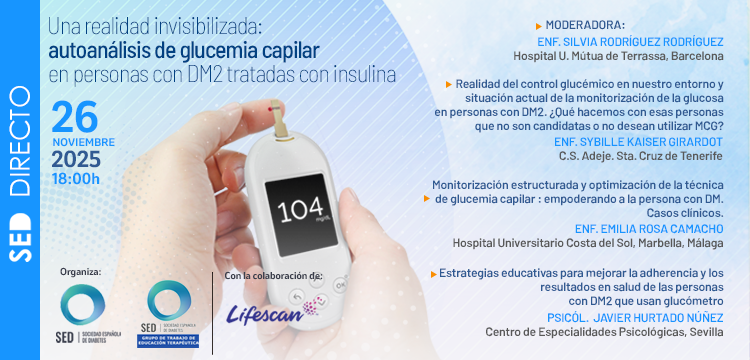El miércoles 26 de noviembre, a las 18.00 h, tienes una cita con la Educación Terapéutica en Diabetes. Un webinar de SED Directo, que dispone de la colaboración de Lifescan, expondrá una realidad invisibilizada: el autoanálisis de glucemia capilar en personas con DM2...